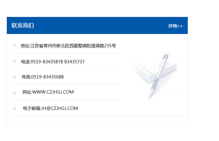 地址:常州市新北區友邦商務大廈1幢16、17層  電話:0519-85101652  傳真:0519-85112595  郵編:213022  網址:www_cz-jiayue_cn.ruihangtech.com  郵箱:xiajifengaa@163.com